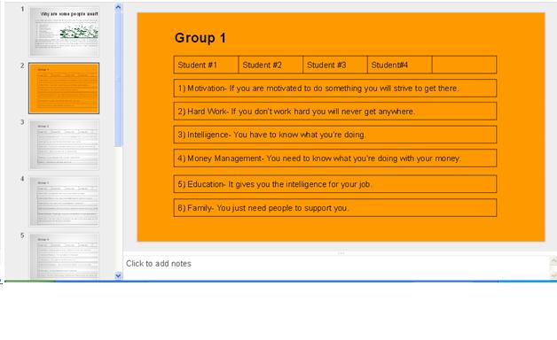 Step 5: Once groups have ranked the items and have justified their rankings, instruct one member from the group to enter their opinions into your Google Presentation. I happen to have two computers in my classroom and have them both logged on to the assignment.